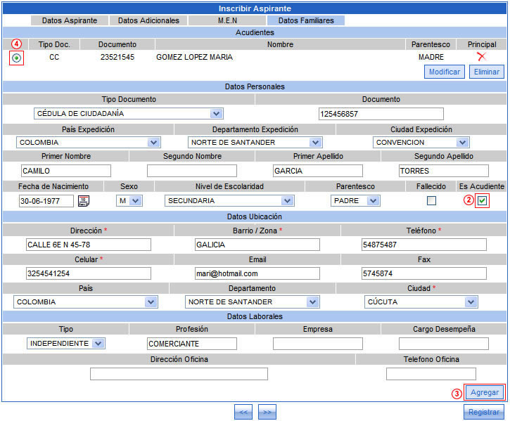 En este formulario se muestra los datos que debe ingresar los para los familiares. Es importante que chequee el cuadro del campo Es Acudiente (Ver ) para indicar que la persona registrada será el Acudiente Principal del estudiante. Después de ingresar todos los datos correspondientes presione el botón Agregar (Ver ) y luego Registrar para guardar los cambios. Usted puede ingresar más de un familiar pero debe chequear el campo Es Acudiente solo una vez.