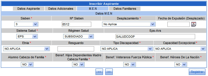 PAS0 4. En M.E.N., En esta pestaña se deben registrar los datos que son requerimiento del Ministerio de Educación Nacional. Ingrese la información solicitada |