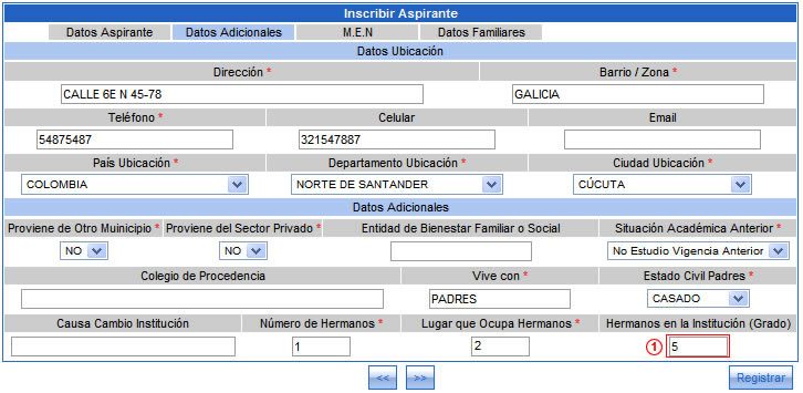 Si tiene hermanos estudiando en la institución, (ver ) debe ingresar los grados que están cursando los cuales deben separarse por comas. |