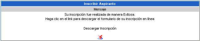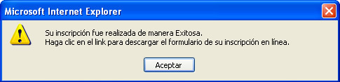 Este mostrará los siguientes mensajes que confirman que el registro fue realizado de manera exitosa. Haga clic en el botón Aceptar y luego en la imagen para descargar el resumen detallado de su inscripción.