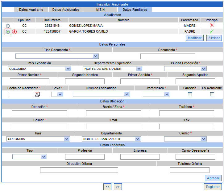 PASO 6. Para ver o modificar datos del acudiente antes de registrar la inscripción: